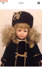 Das collectable porcelain doll,hand painted face, Russian style clothing in excellent condition stands 20" with stand, box slightly weathered.