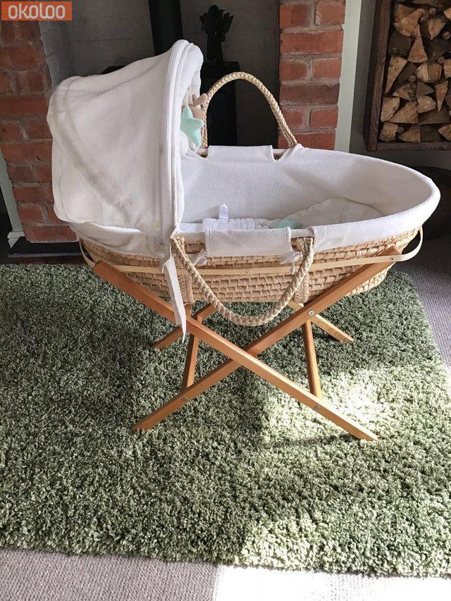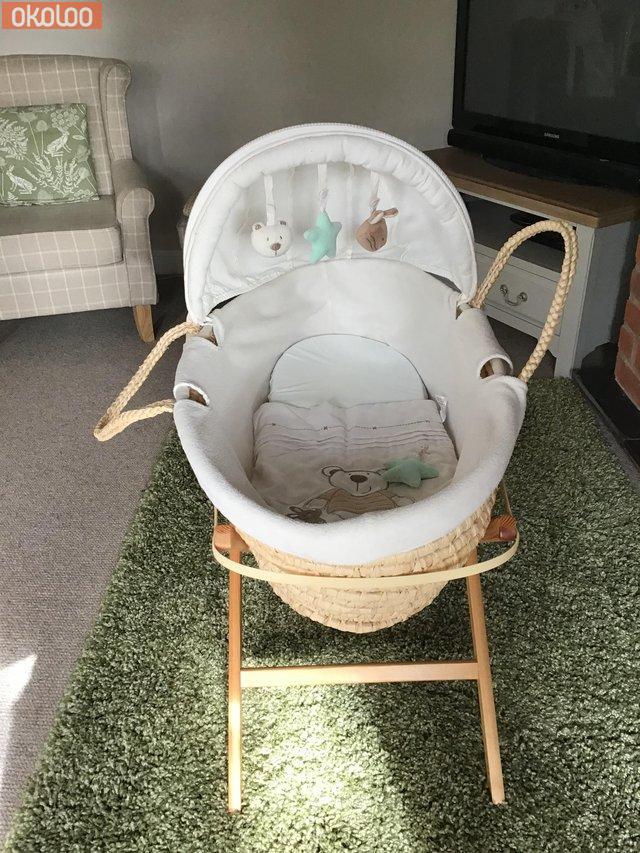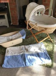 Moses basket and stand +baby bath + blue cot quilt and bumpers excellent condition £25 the lot