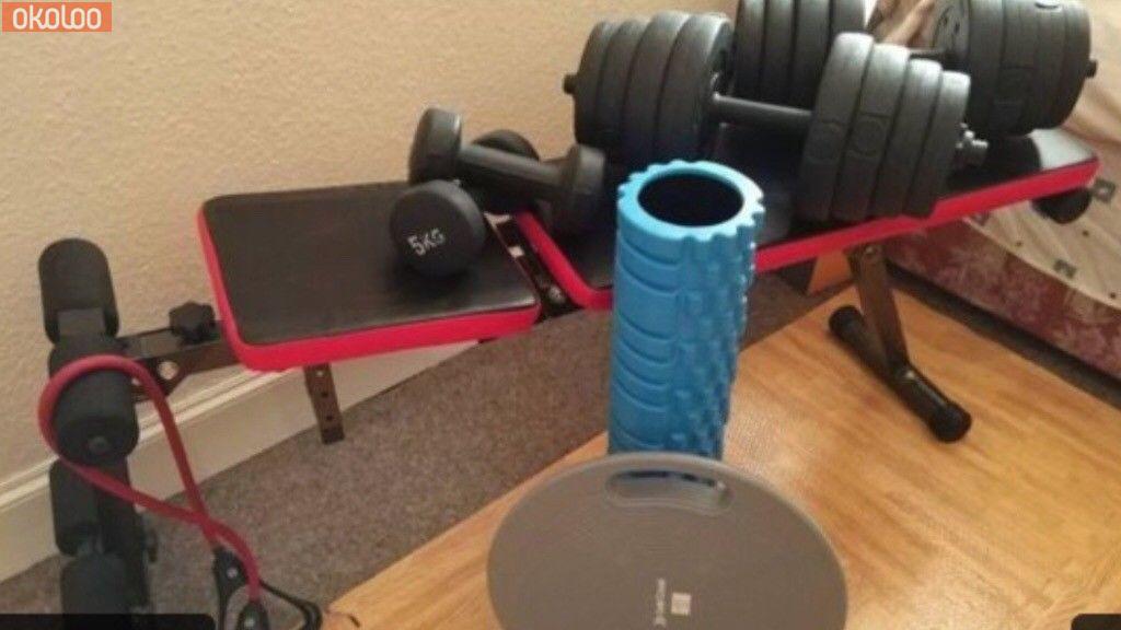 Weights bench, variety of free weights, bands as pictured.