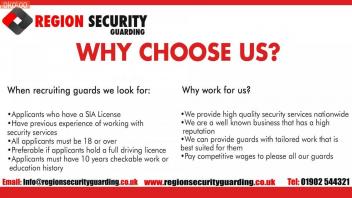Region Security Guarding provides a range of security services delivered by a team of trained professionals. We are based in the West Midlands but deliver our services nationwide. As one of the industries leading companies, Region Security Guarding carries years of experience in the security sector. We are committed to providing high quality standards with a cost effective solution. We recognise that first class security guarding lies with the performance of our team of Security Officers and Supervisors. Our Security Officers are fully vetted (BS7858), trained and licensed to meet standards set by the Security Industry Authority (SIA).