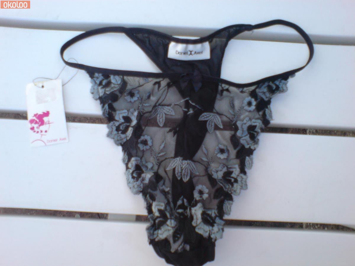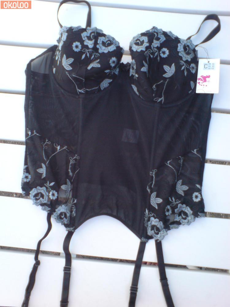 New unworn black lingerie set with tags. Consists of a floral lace embroidered boned basque/corset/bustier with matching thong panty. Removable and adjustable straps, fastens with hooks and eyes at back. Underwired padded cups size C40, panty size M.